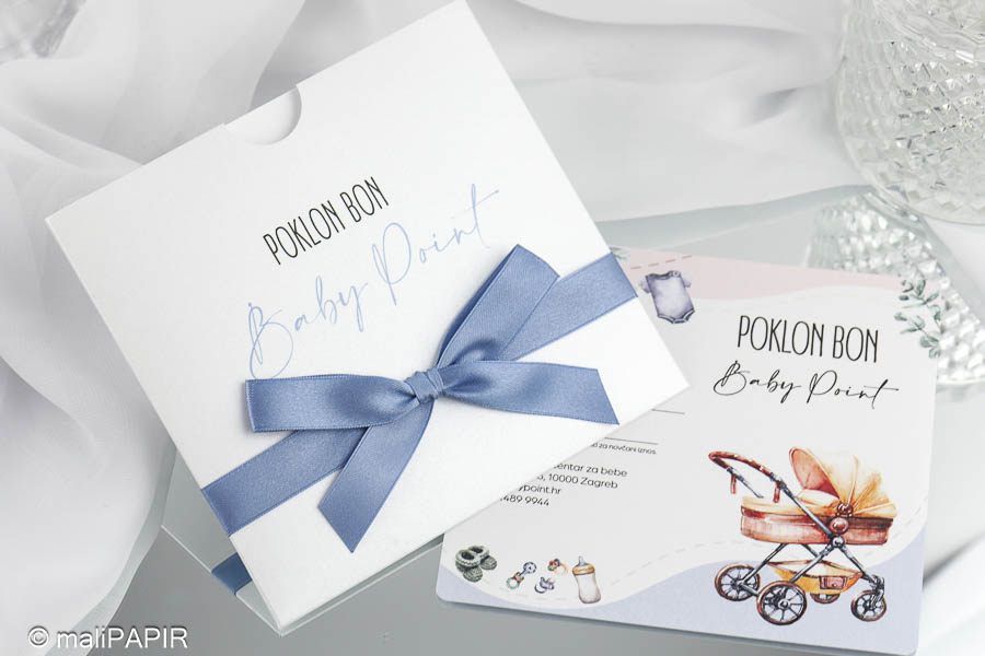 Izrađen je u obliku etuia u koji se umeće kartica s tekstom. Dodatno je ukrašen satenskom mašnom. Tisak se nalazi na etuiu i kartici (jednostrano).